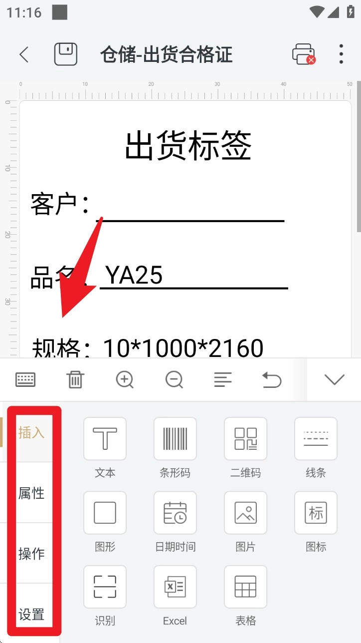 进入模板编辑页面后,底部功能区设有插入选项,点击后可添加条码、文字、图片等各类元素,还能实时对这些元素进行编辑并预览最终样式效果。