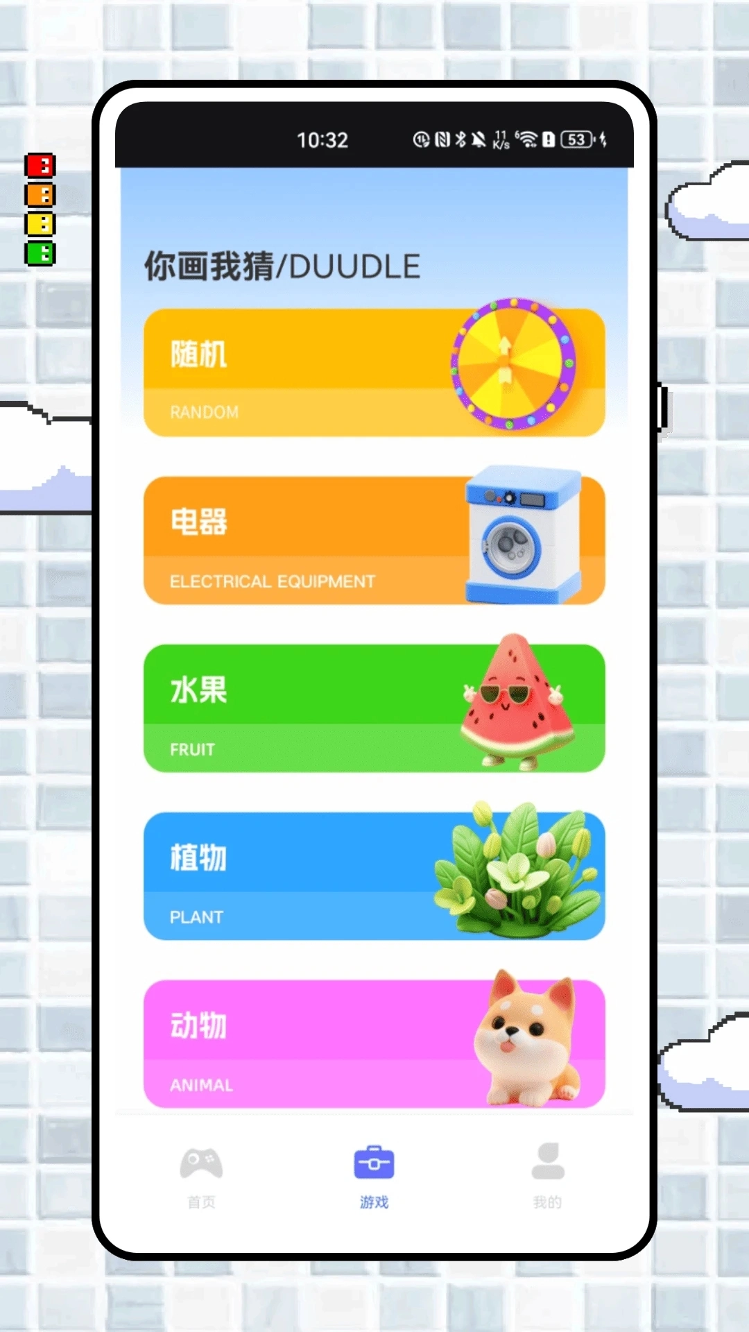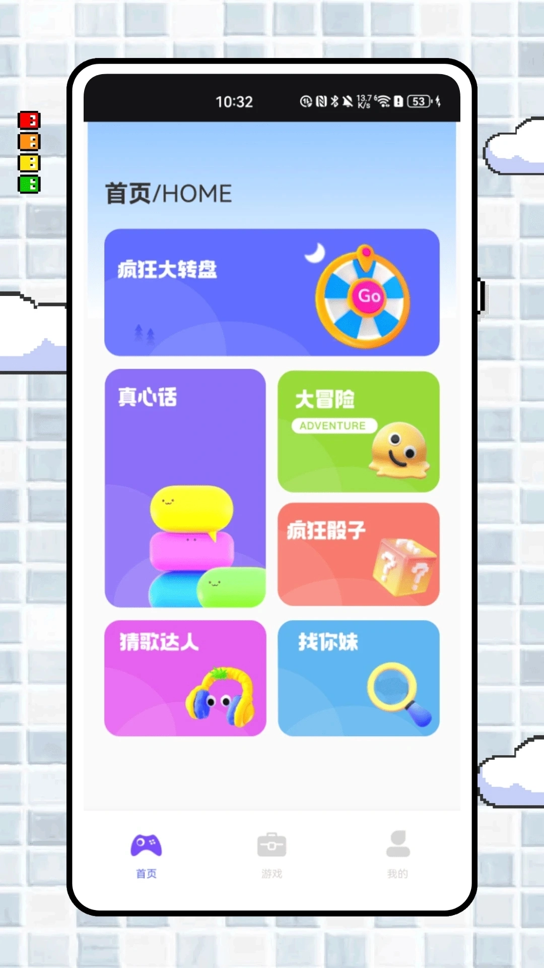 飞智游玩厅是一款聚焦聚会娱乐场景的趣味应用,整合了多款经典互动游戏。首页设有疯狂大转盘、真心话大冒险、疯狂骰子等热门桌游,同时搭配猜歌达人、找你妹等休闲挑战类游戏,能快速调动派对气氛。游戏页面包含超受欢迎的你画我猜模块,覆盖电器、水果、动物等十大主题库,支持多人在线竞技。该应用界面设计清新可爱,操作便捷流畅,无论是线下聚会时用来打破尴尬氛围,还是线上与好友联机互动,都能让用户尽享欢乐时刻,是年轻人社交娱乐的得力助手!