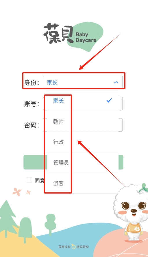 接下来在身份选择界面,依据自身角色选择家长、教师、行政、管理员或是游客。
