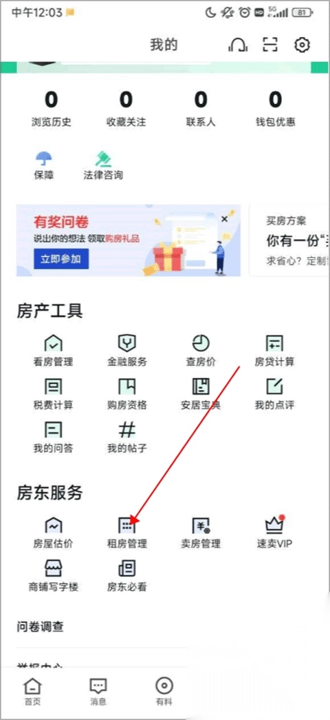 2、来到我的界面,找到房东服务中的租房管理。