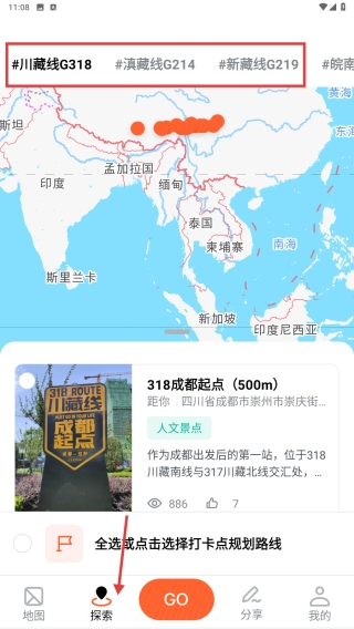 你可以切换到探索页面,去查看川藏线G318、滇藏线G214这类热门骑行路线的相关内容。