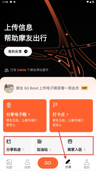 进入分享页面后,摩友可以选择分享电子眼、打卡点或骑行轨迹,也能查看加油站信息和商家入驻详情,为出行提供便利。