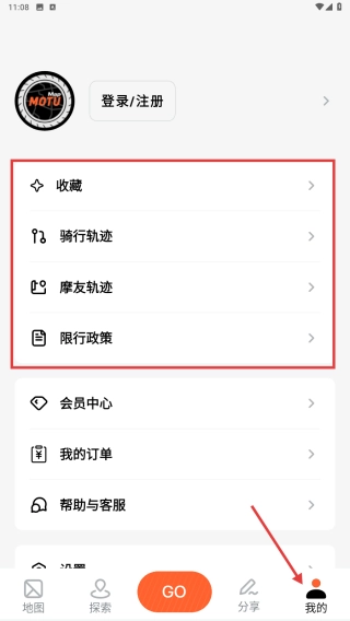 打开我的页面,可查看收藏、骑行轨迹、摩友轨迹和限行政策等与个人相关的内容。