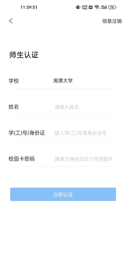 1、打开软件后,第一步需完成师生认证流程,依次输入姓名、身份证信息和校园卡密码,随后点击“立即认证”按钮即可。
