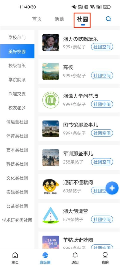 3、还可以在班级圈加入各种社圈,像是学校吃喝玩乐、图书馆哪些事儿、军训哪些事儿等等,了解校园各种有趣的事