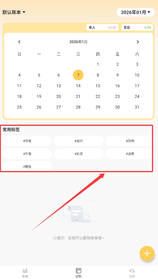 打开软件首页,清晰的年月收支汇总和日历视图即刻呈现,常用标签可助你快速选择分类,点击下方加号就能开启记账操作啦。