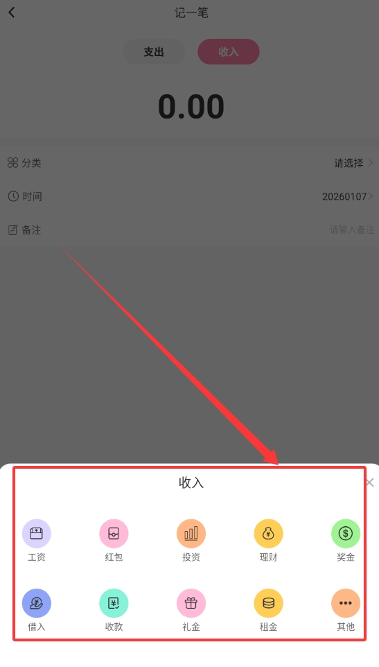 要记录收入的话,切换到收入标签页,从工资、红包这些图标里选择对应的收入类型,再填好金额和说明信息,这样就能完成记账操作了,挺方便的。