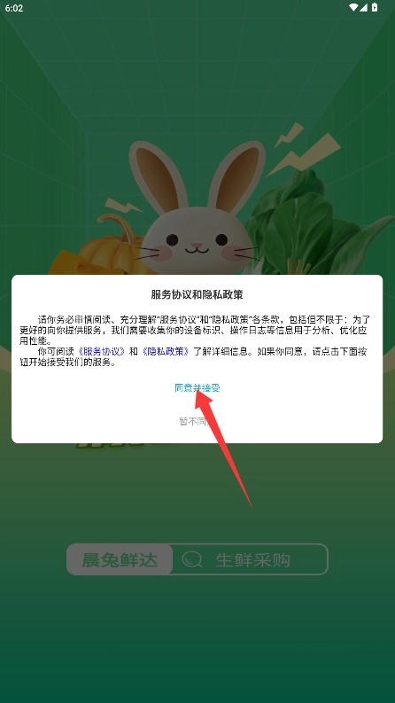 首次使用时,请仔细阅读平台的服务条款和隐私政策,确认无误后,点击“同意并接受”按钮即可进入应用。