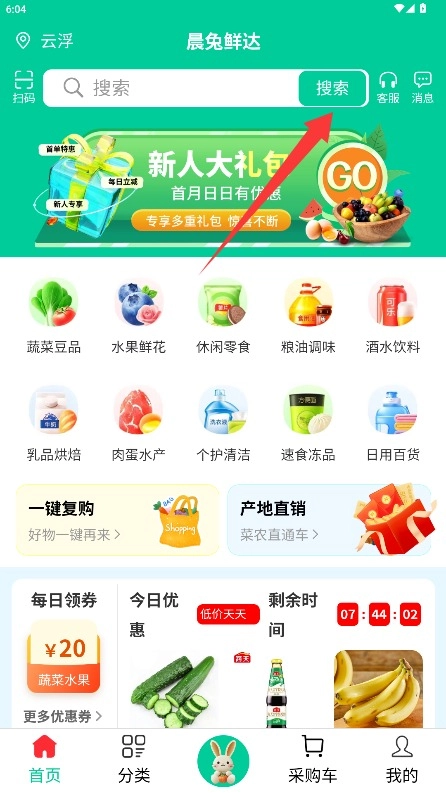在首页商城顶部的搜索栏中输入商品名称或相关关键词,即可搜索并浏览所需的生鲜食材。