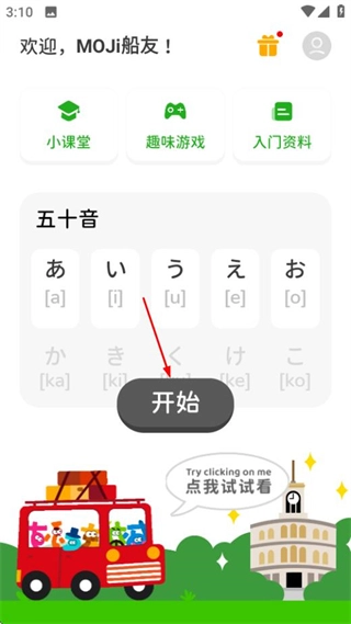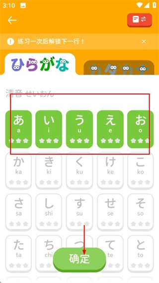 在MOJiKana首页点击开始按钮,就能进入五十音练习的选择页面。