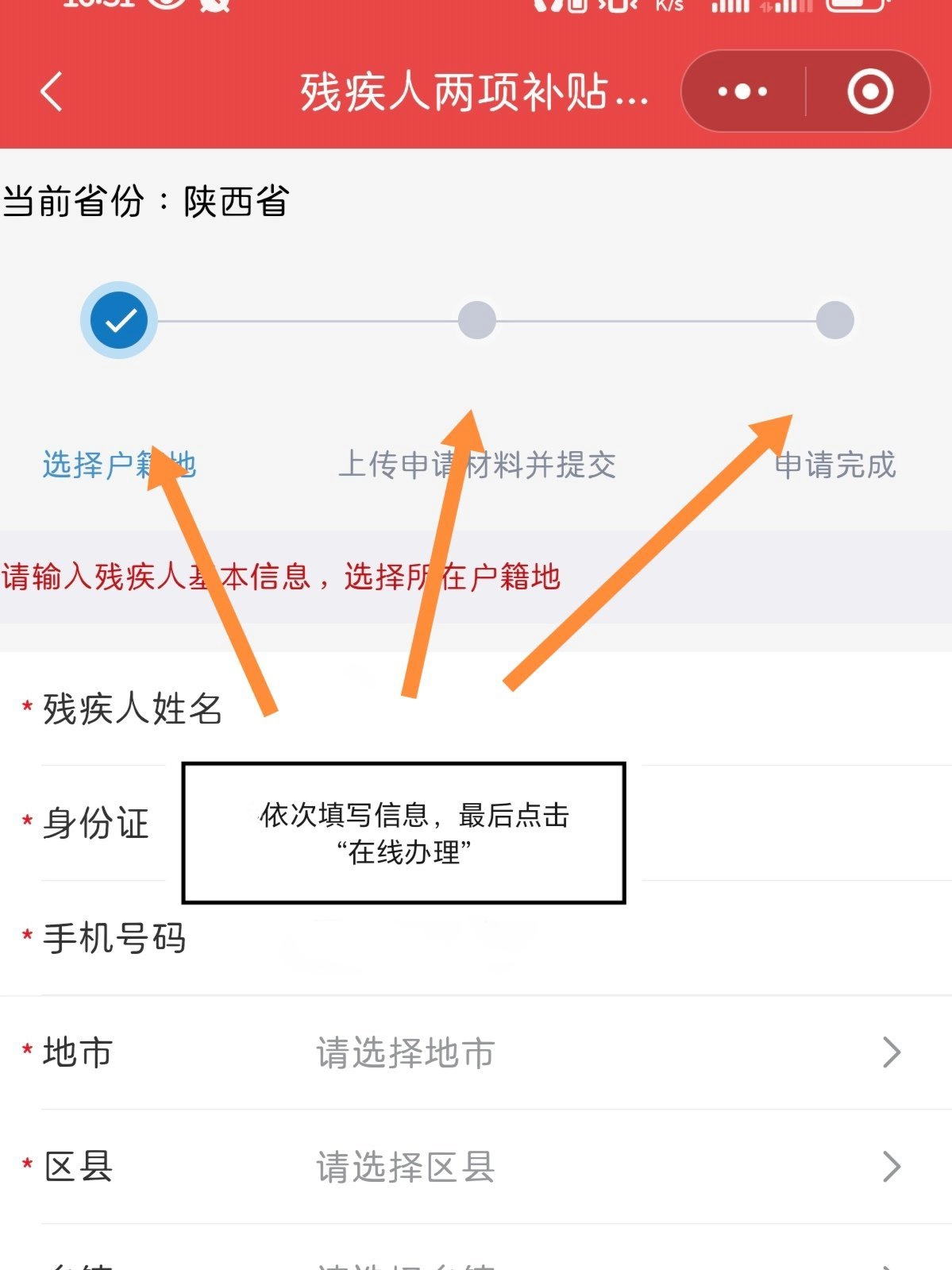 接着填写一些具体的信息,填好之后点击“在线办理”按钮就可以了。