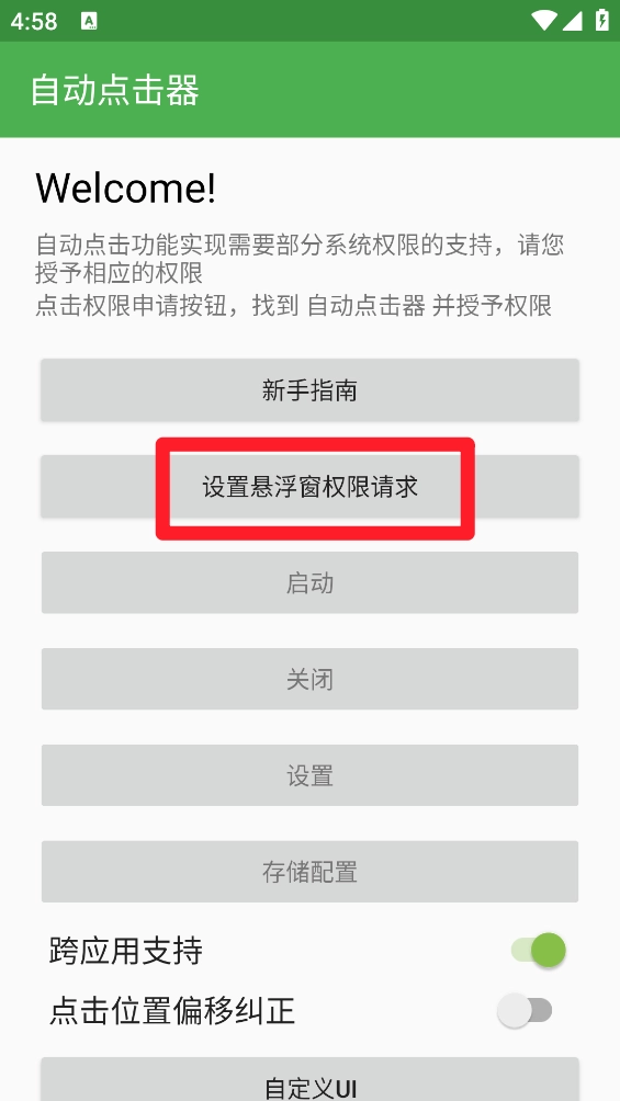 2、完成后进入主页,点击"设置悬浮窗权限请求"。