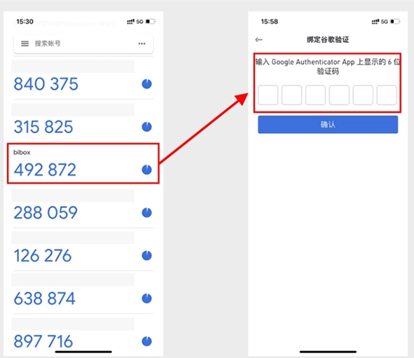 ②添加完成后,界面会显示6位数字和对应的账号名(这6位数字就是一次性的谷歌验证码);把生成的验证码填写到Bibox的谷歌验证开启页面,就能完成绑定操作。