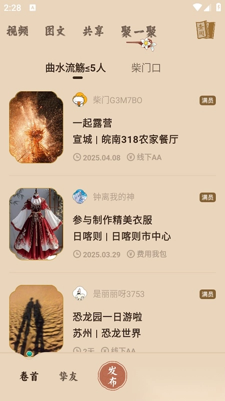登录后,用户可在首页发布动态,只需点击页面上的加号按钮即可完成操作。在浏览其他用户发布的动态时,能够进行点赞、评论、收藏或转发等互动。而在聚一聚板块里,用户既可以查找自己感兴趣的线下活动,也能够自行发起聚会。