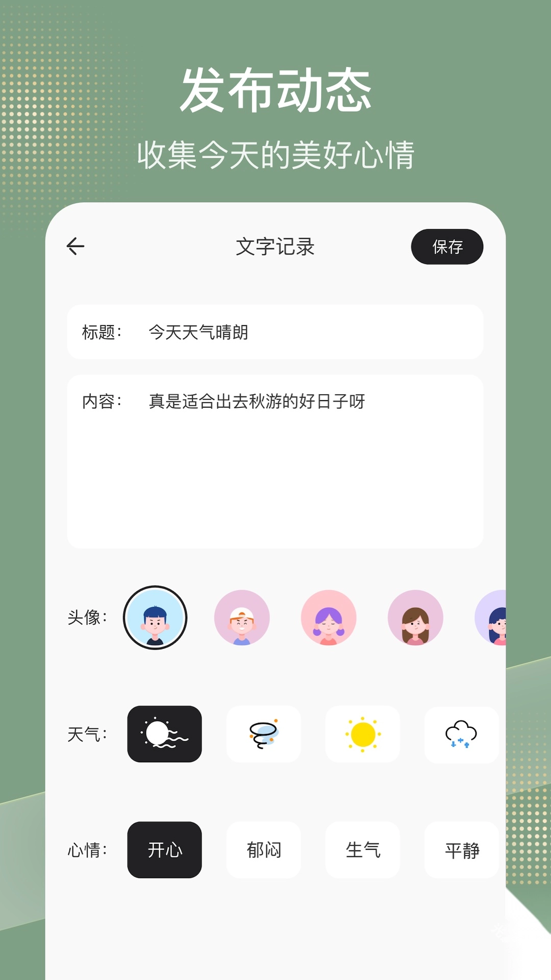 情绪树洞的界面设计美观清爽,为用户配备了多种不同的记录模式,让大家能在软件上畅快书写自己的快乐与悲伤。在快节奏生活的当下,不少人心中积压着难以排解的情绪,这款软件正是针对这类需求,为用户打造了一个纯净的记录平台。用户可以自主选择不同的记录方式,将内心想法毫无束缚地书写出来,而且软件采用了严格的保密技术,保障每位用户都能享受到高度私密的记录服务。