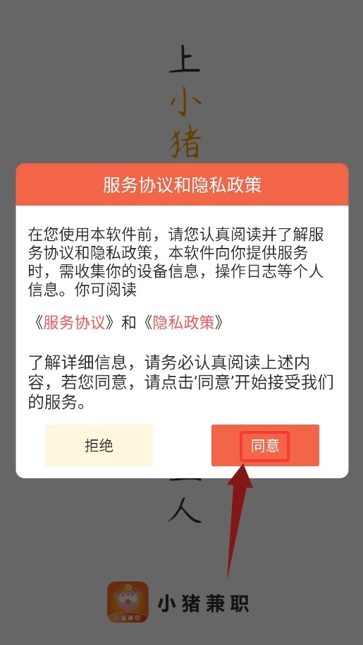 首次打开应用时,需要点击确认弹窗中的协议,同意之后才能进入主界面。
