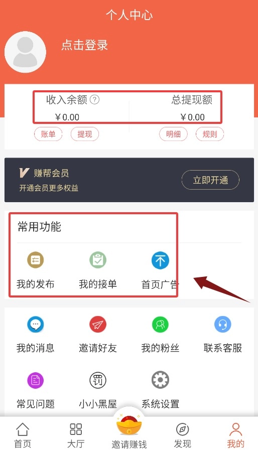 在个人中心里,你可以查看自己的收入余额、提现限额,以及发布和接单的记录。