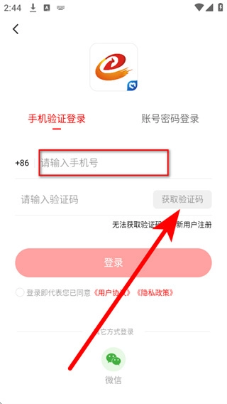 在登录页面,填写请输入手机号,点击获取验证码。