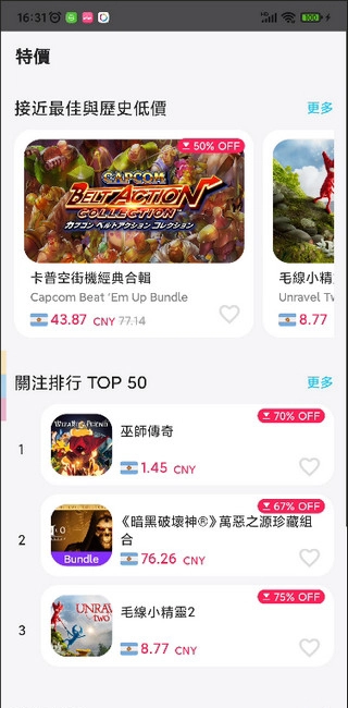 在首页的特价专区里,可以看到当前最热门的50款打折游戏,这些游戏大多价格亲民,并且拥有较高的知名度,价格范围大约在一两元到十几元不等,性价比非常高。