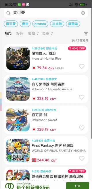 例如输入“宝可梦”,就可以查看宝可梦相关游戏的所有折扣情况。
