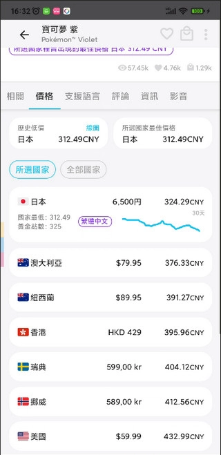 点击任意一款游戏,即可查看该游戏对应的相关商品、各地区的价格、所支持的语言以及用户评论等丰富信息。