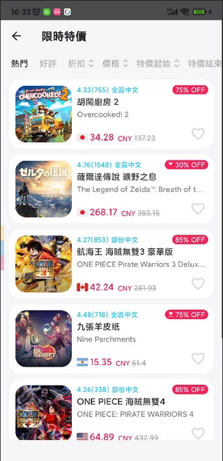 帮助用户直观查看处于特价状态且折扣力度最大的游戏,支持各区域价格比对与货币形式切换,助力用户实现高性价比购买。 2. 若用户心仪的游戏开启特价活动,系统会及时推送通知,保障用户不错过优惠时机。 3. 设有评分功能,用户可对喜爱的游戏进行支持,推动优质游戏吸引更多关注。