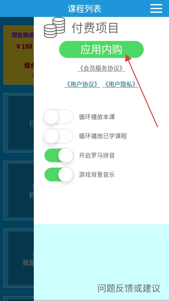 在功能菜单中,点击应用内购,进入付费项目页面。