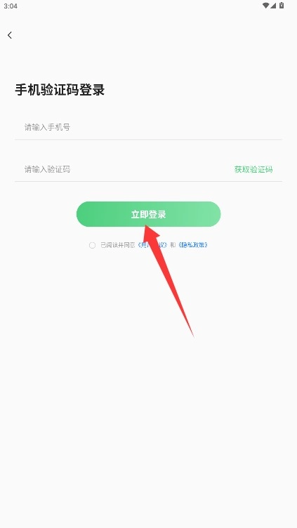 在登录页面填写手机号与验证码,勾选同意相关条款后,点击“立即登录”按钮即可进入应用。