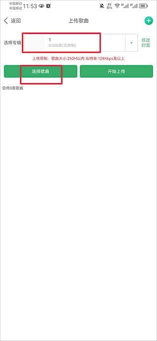 接下来在上传歌曲的界面里,挑选刚才创建好的专辑名称,选好之后点击“选择歌曲”按钮。
