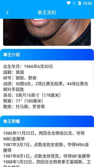 您可以访问每个拳击冠军的基本信息,从而更深入地了解他们的拳击风格,签名动作和战斗技术,并全面了解他们的个人特点。