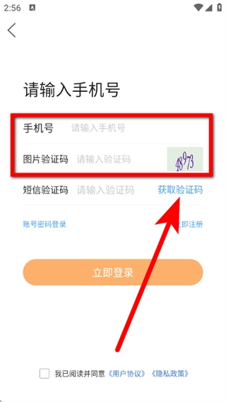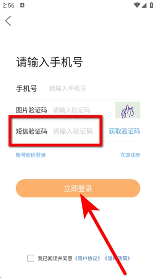 在短信验证码输入框中完成勾选操作后,点击“立即登录”按钮,即可完成账号登录流程。