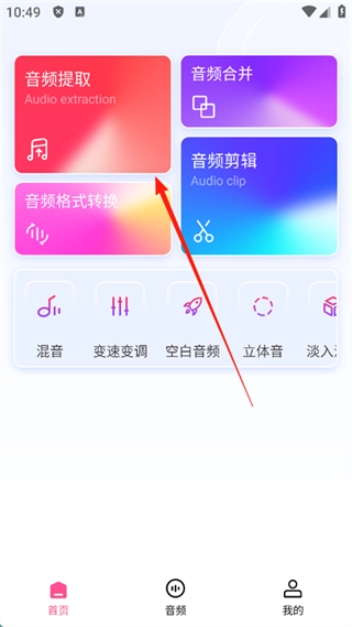 进入软件首页,你会发现它功能十分强大,涵盖了音频提取、音频合并、音频格式转换以及音频剪辑这四项服务,能助力你轻松地从各类视频中提取出所需的音频内容。