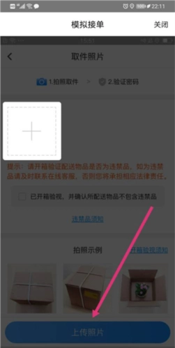 上门取件时,先点击“我已就位”,接着点击“验证取件”,随后对配送物品拍照并上传照片。拍照需确保物品完整呈现:若是二次包装的物品,需开箱验货并拍摄物品本身,不可仅拍外包装;对于封口的餐饮订单,则需拍摄两张照片,一张是小票的单独照片,另一张是物品与小票的组合照片,且两者都要拍全。