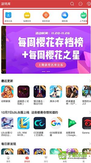 3、打开游戏库,这里有游戏分类、免费软件、单机热游、国际服等各类游戏推荐;