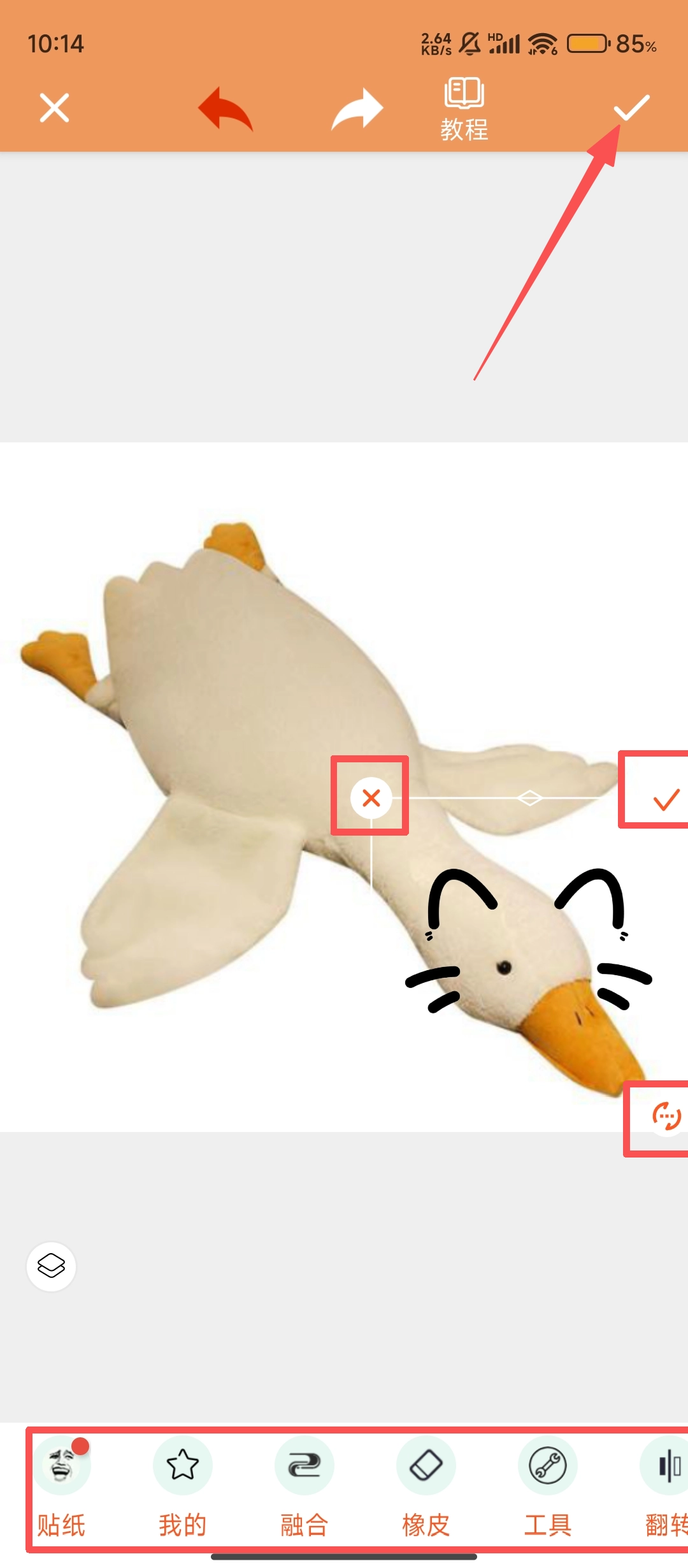 编辑好后,点击右上角的对勾按钮就能保存这张搞怪图片啦,赶紧分享给好友一起斗图吧。