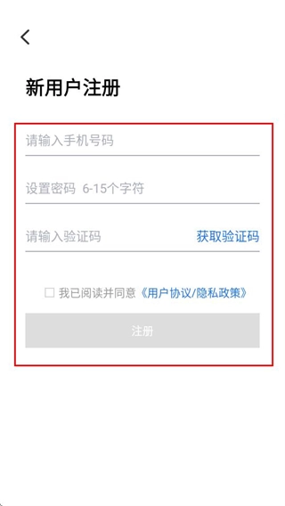 在新用户注册页面输入相关信息,勾选协议后点击注册按钮,即可完成注册流程。