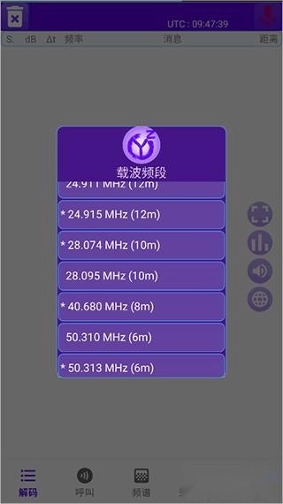 3、进入软件主界面后,应用会自动扫描当前频段的 FT8 信号并实时解码,通联信息(如对方呼号、信号强度、网格定位)将显示在屏幕上。