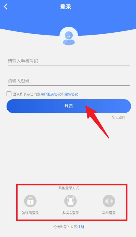 用户在登录页面可以输入手机号和密码,勾选同意服务协议后点击登录按钮,也能选择验证码登录、多模态登录以及声纹登录等多种便捷的登录方式。