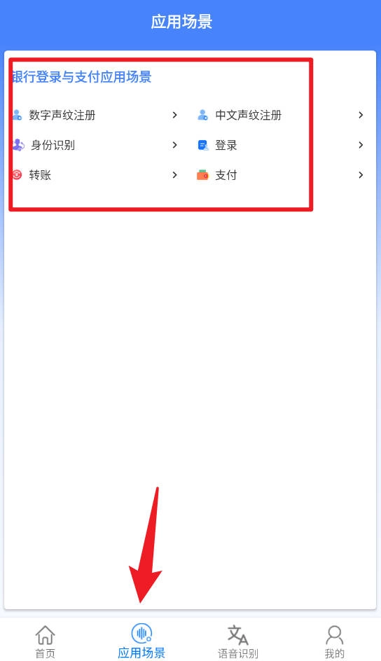 应用场景页面设有银行登录、身份识别、转账、支付等功能的详细入口,用户可依据自身需求,快速完成数字声纹或中文声纹的注册及相关操作。