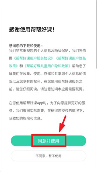 1、安装并打开帮帮好课,进入感谢使用帮帮好课提示界面后点击同意并继续。