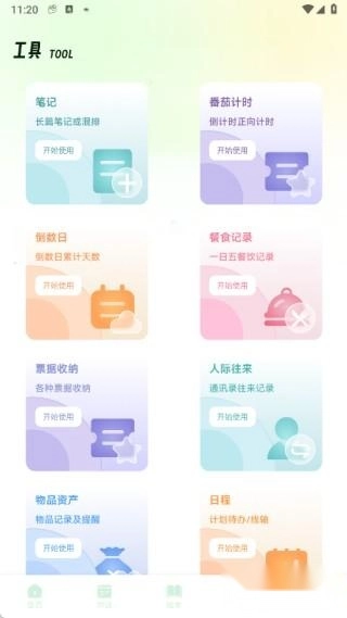 4、在工具页面中有笔记、番茄计划、倒数日、餐食记录、票据收纳、人际往来、物品资产和日程等功能。