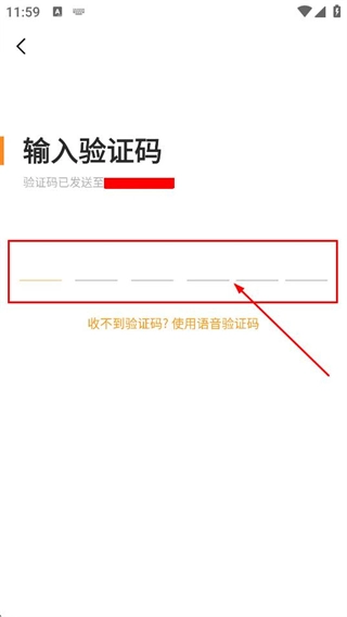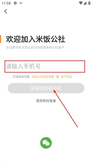 在验证码输入页面,填写接收到的验证码,以完成米饭公社的登录流程。