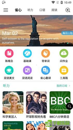 在省心英语的主界面上,能看到新概念、背单词、问作业等不少实用功能。