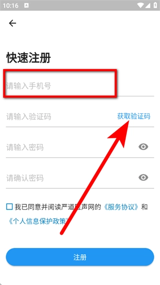 在快速注册页面,输入手机号,点击获取验证码。