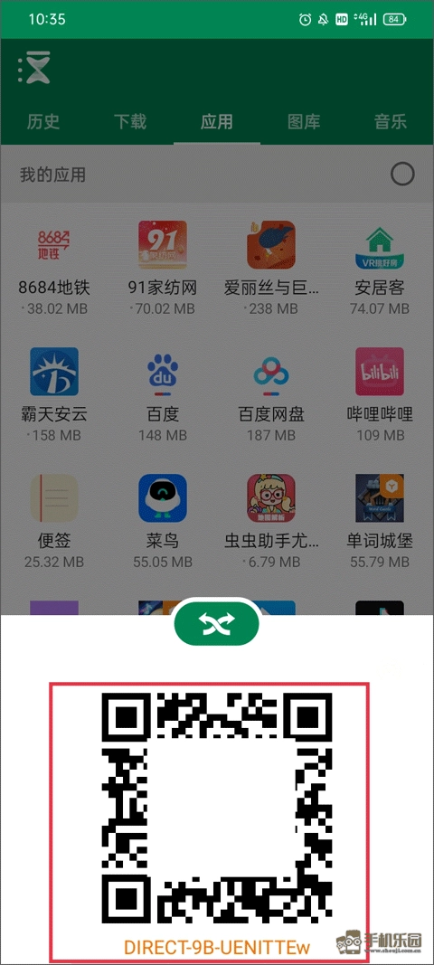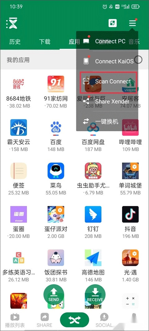 5、另一部手机需点击右上方的三横图标,选择“Scan Connect”。将扫描框对准该二维码,就能快速互传对应的应用、图片、音乐等内容。