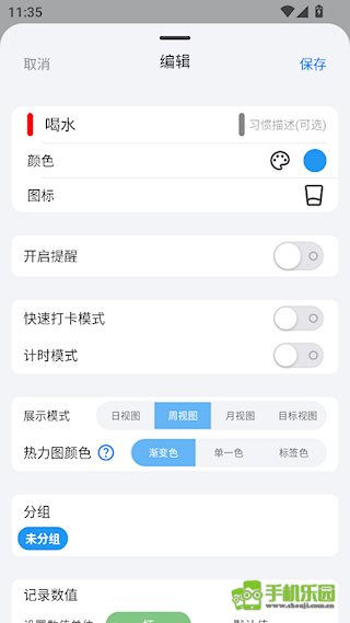 3、设置习惯的内容,如提醒、分组等,完成后点击保存完成设置