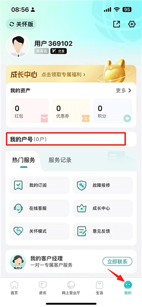 打开应用后,进入“我的”页面,找到并点击“我的户号”选项。