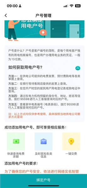 在户号管理页面,你可以查看所有已绑定的户号;不过在此之前得先绑定户号,获取用电户号的具体方法见下图(出于安全考虑,平台现在已禁止绑定他人户号)。
