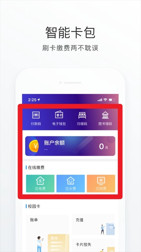 进入智能卡包界面后,可进行电子钱包余额查询以及水电网费的线上缴纳操作。