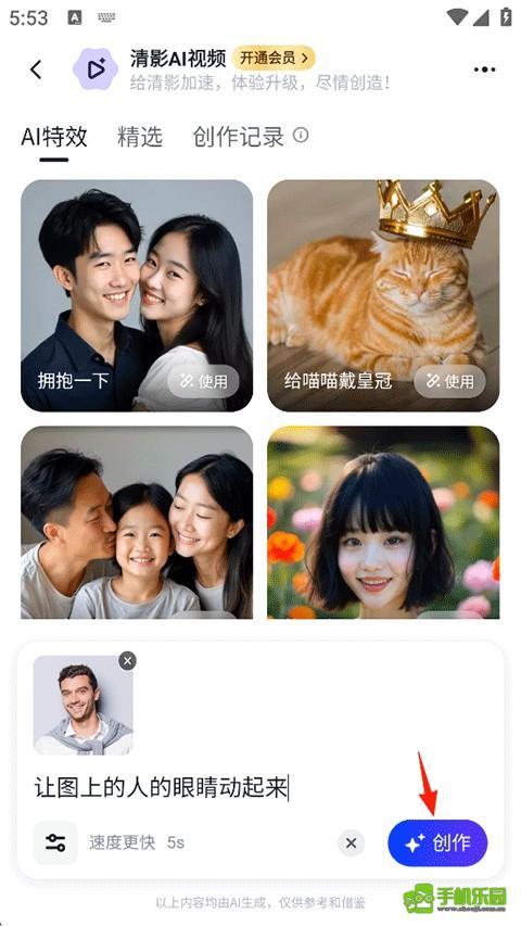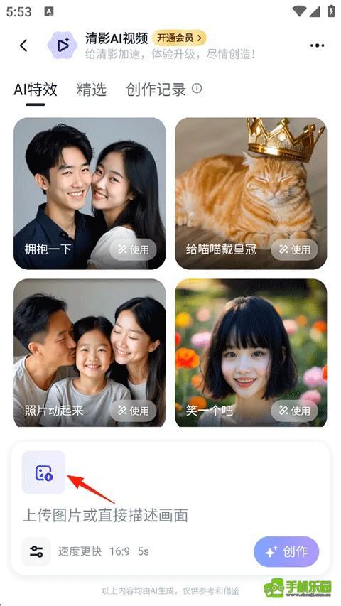 3、接着在输入框描述画面,最后点击创作即可。(此功能需要开通会员)